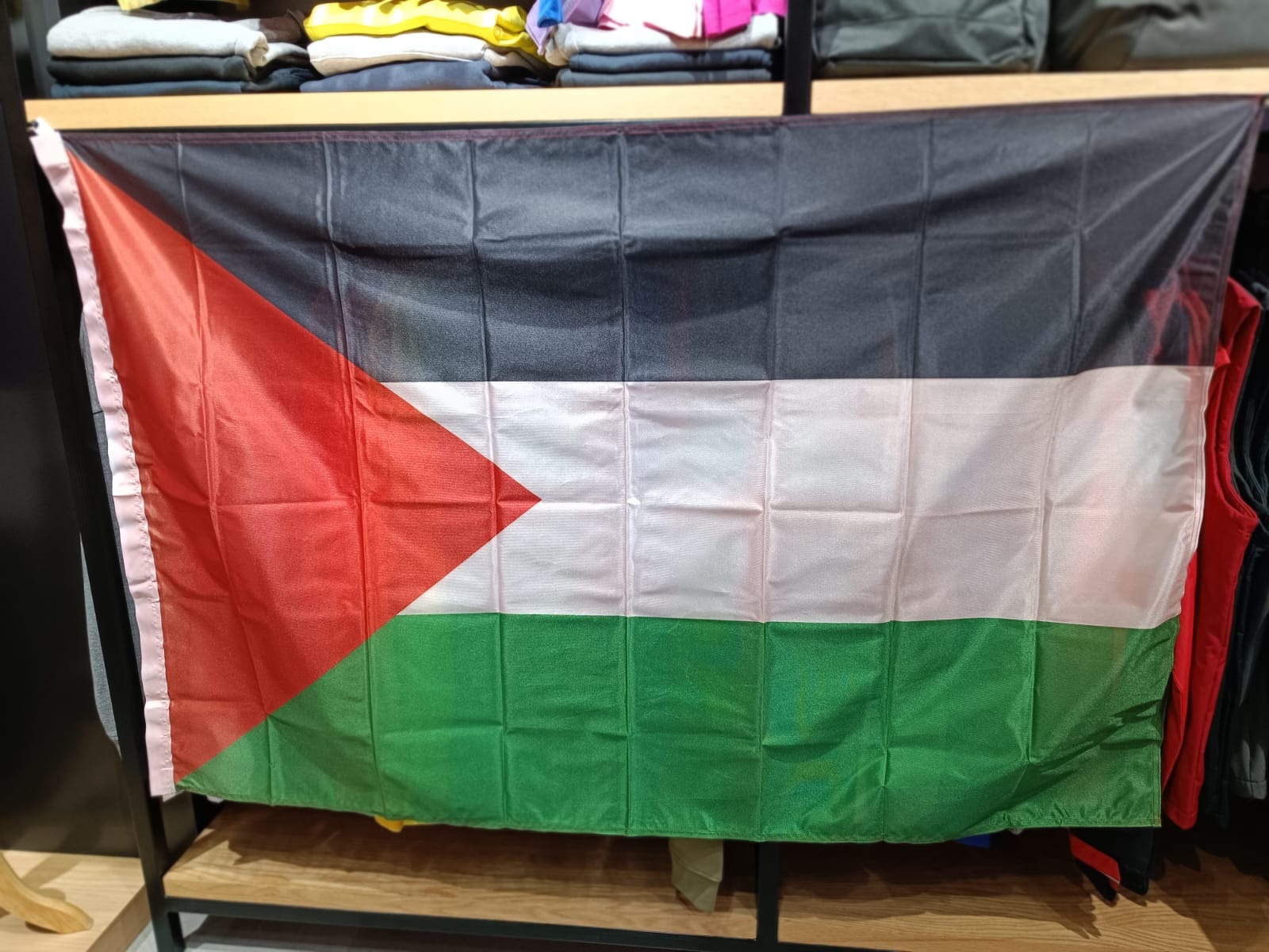 The flag of Palestine is a tricolor of three equal horizontal stripes overlaid by a red triangle issuing from the hoist